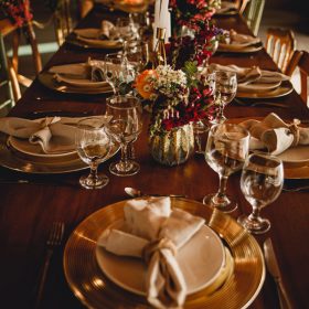 Na recepção, os convidados foram servidos em mesa posta com um delicioso jantar regado a bebida de qualidade.